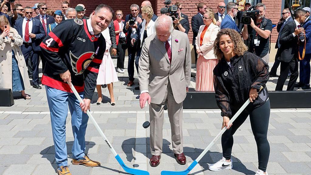 Image: It was too warm for ice hockey, but the King helped kick off a street hockey game. PHOTO BY BBC